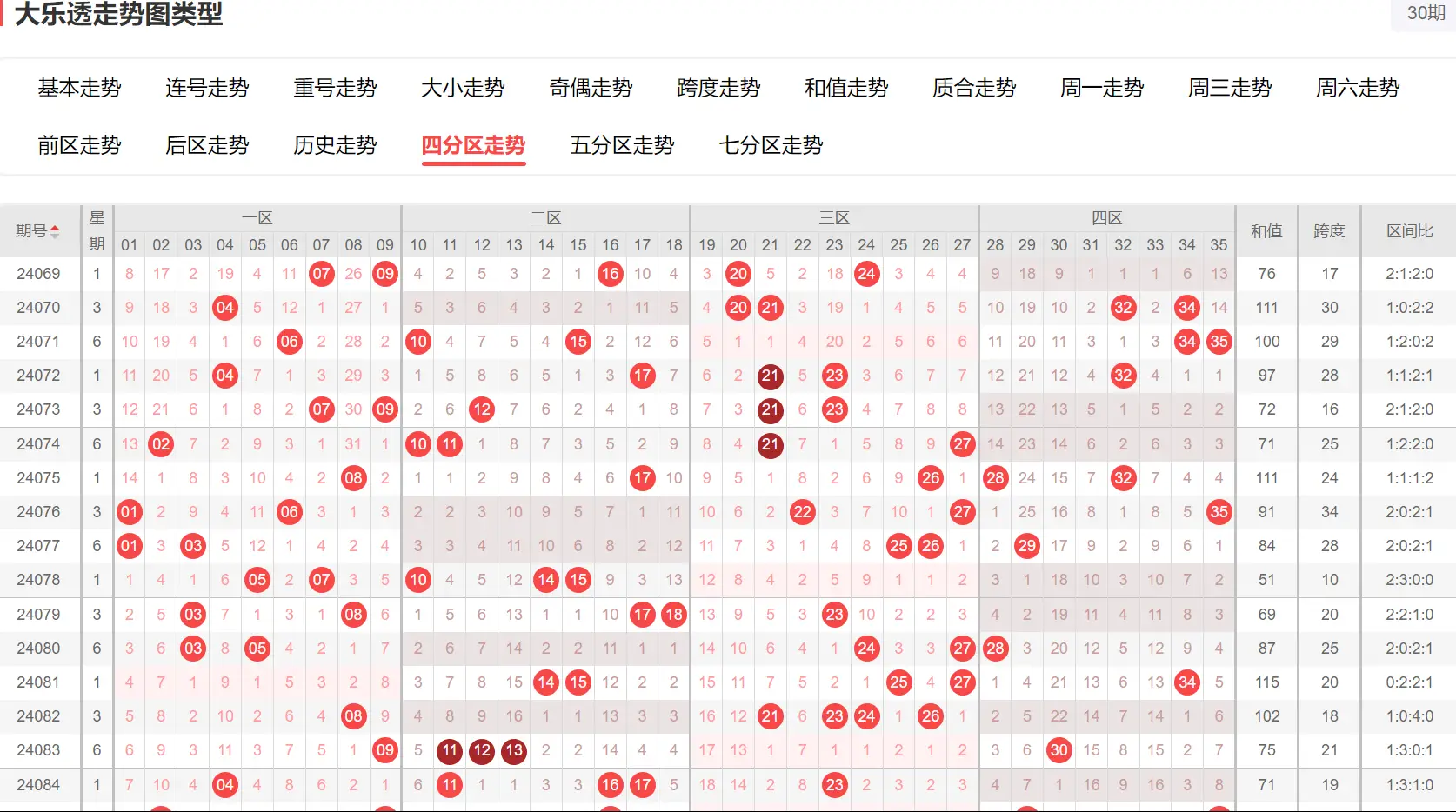 大乐透有个很有意思的现象,就是每年的同一赛期(比如每年的第030期),开奖号码往往会呈现出某种奇妙的对称感。这也就是咱们常说的“历史同赛期数据”。